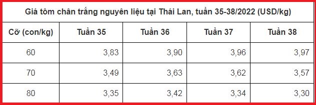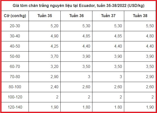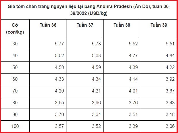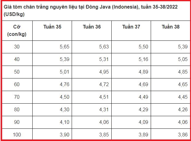 Giá tôm nguyên liệu tại một số nước cung cấp (tuần 35 - 39/2022)