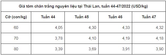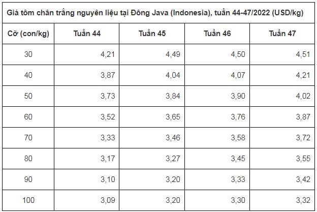 Giá tôm nguyên liệu tại một số nước cung cấp (tuần 44 - 48/2022)