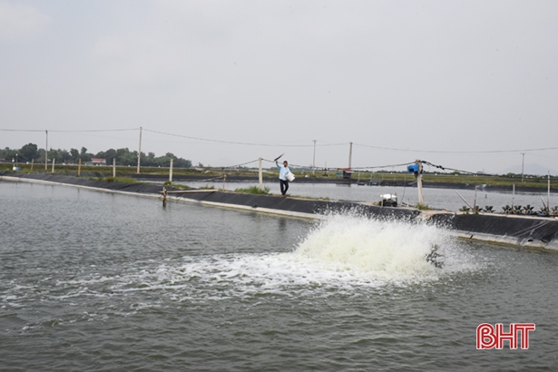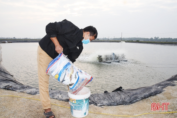 Người nuôi tôm vùng Hà Lầm (xã Thạch Sơn) đang tập trung chăm sóc tôm sau đợt mưa rét kéo dài.