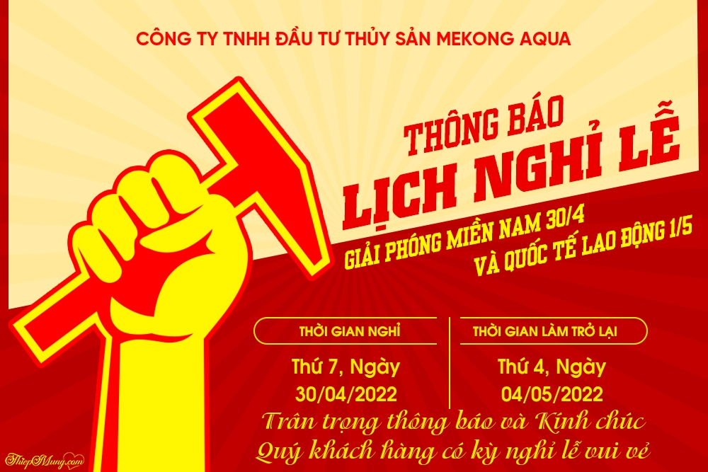 Công ty TNHH Đầu tư Thủy sản Mekong Aqua xin trân trọng thông báo lịch nghỉ lễ ngày Giải phóng Miền Nam và Quốc tế Lao động 30/4 - 1/5 đến toàn thể Quý Khách hàng, đối tác, đại lý.