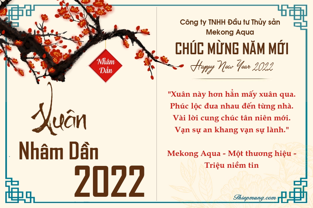 Cảm ơn bạn đã trở thành khách hàng của Công ty TNHH Đầu tư Thủy sản Mekong Aqua trong thời gian qua. Bước sang năm mới, Công ty TNHH Đầu tư Thủy sản Mekong Aqua xin chúc bạn dồi dào sức khỏe, làm ăn phát đạt, gặp nhiều may mắn và tiếp tục tin tưởng vào chúng tôi. Chúc mừng năm mới an khang, thịnh vượng!