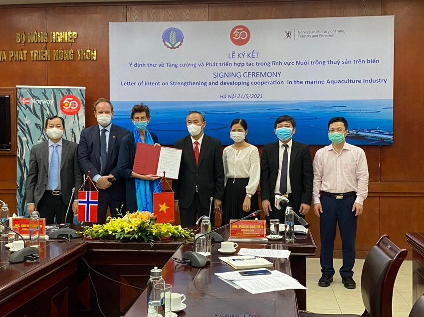 Nhân kỷ niệm 50 năm thiết lập quan hệ ngoại giao Na Uy - Việt Nam (1971 - 2021), Bộ Nông nghiệp và Phát triển Nông thôn Việt Nam cùng Bộ Công thương & Thủy sản Na Uy ký kết Ý định thư về Tăng cường và Phát triển Hợp tác trong lĩnh vực nuôi trồng thủy sản trên biển.