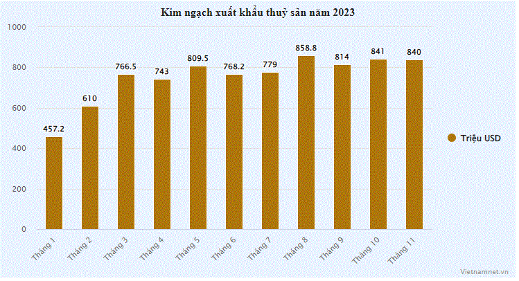 Thống kê từ Tổng cục Hải quan, tháng 11/2023, xuất khẩu thuỷ sản của nước ta đạt gần 840 triệu USD, tăng 6% so với tháng 11/2022. Trong đó, xuất khẩu tôm tăng 4%, cá ngừ tăng 26%, cá tra tăng 12%, mực và bạch tuộc tăng 3%, cá biển khác tăng 4%...