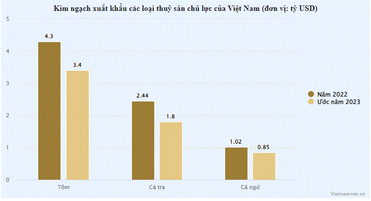 Tuy nhiên, luỹ kế 11 tháng năm 2023, ước tính kim ngạch xuất khẩu thủy sản chỉ đạt 8,27 tỷ USD, giảm mạnh 19% so với cùng kỳ năm ngoái. Cụ thể, xuất khẩu cá tra thu về 1,7 tỷ USD, giảm 26% so với cùng kỳ năm ngoái; tôm đạt 3,15 tỷ USD, giảm 22%; cá ngừ đạt khoảng 774 triệu USD, giảm 18%; xuất khẩu các loại cá giảm 7%; mực, bạch tuộc, nhuyễn thể có vỏ, cua ghẹ vẫn tăng trưởng âm từ 10-13%.